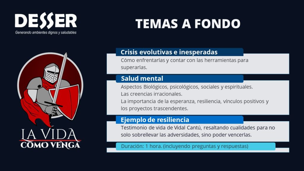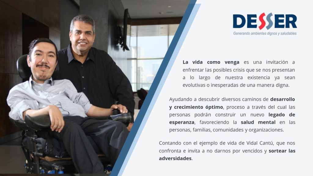 La vida como venga es una invitación a enfrentar las posibles crisis que se nos presentan a lo largo de nuestra existencia ya sean evolutivas o inesperadas de una manera digna ayudando a descubrir diversos caminos de desarrollo y crecimiento óptimo proceso a través del cual las personas podrán construir un nuevo legado de esperanza favoreciendo la salud mental en las personas, familias, comunidades y organizaciones. Contando con el ejemplo de vida de Vidal Cantú, que nos confronta e invita a no darnos por vencidos y sortear las adversidades.